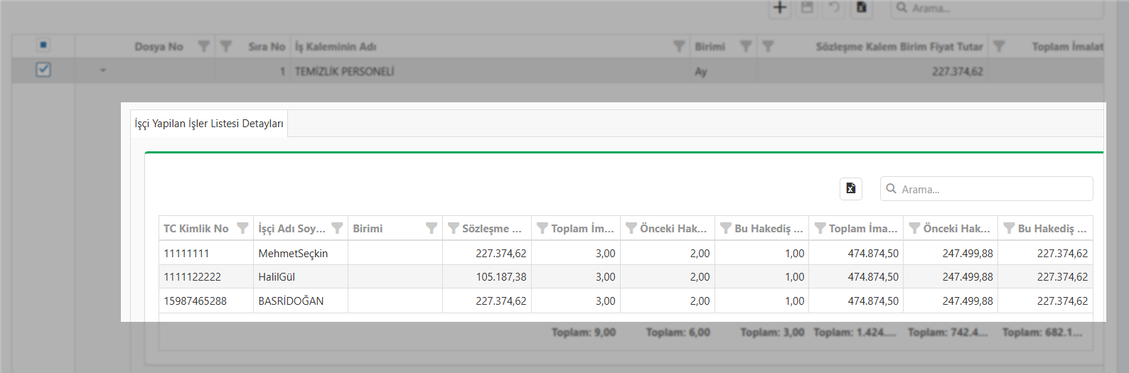Listede yer alan genel tutarların arka planındaki kırılımları görmek oldukça kolaydır. Yapılan işler listesine yansıyan tutarların kişi bazlı dağılımını incelemek için ilgili satırdaki butonuna tıklamanız yeterlidir. Açılan ekran, size doğrudan işçi bazlı maliyetleri detaylı bir tablo halinde sunacaktır.