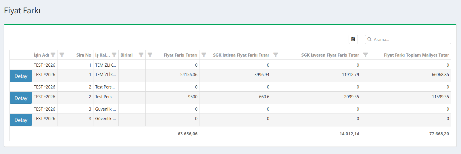 Fiyat Farkı ekranı, standart birim maliyetlere dahil olmayan ancak sendika tarafından belirlenen sosyal hakların hakedişlere yansıyan toplam tutarlarını listelediği özel bir alandır. Sendikal sözleşmelerden doğan ek ödeme ve farkların toplu takibi bu bölümden sağlanır.