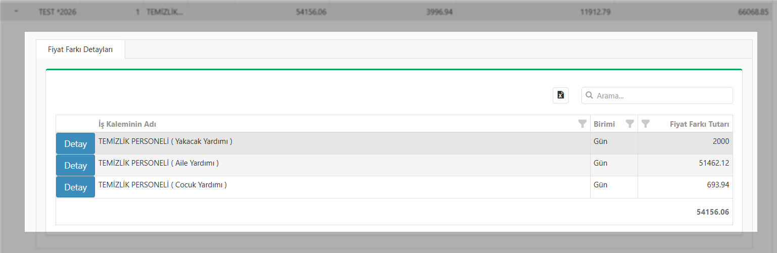 Yapılan işler listesinde olduğu gibi, bu sayfada da öncelikle kalem bazlı genel toplamlar yer alır. Bu tutarların işçi bazında kime, ne kadar yansıdığını görmek için yine satır hizasında bulunan menüsüne tıklayabilirsiniz. Bu işlem, fiyat farkı tutarlarının personel düzeyindeki ayrıntılarına şeffaf bir şekilde ulaşmanızı sağlar.