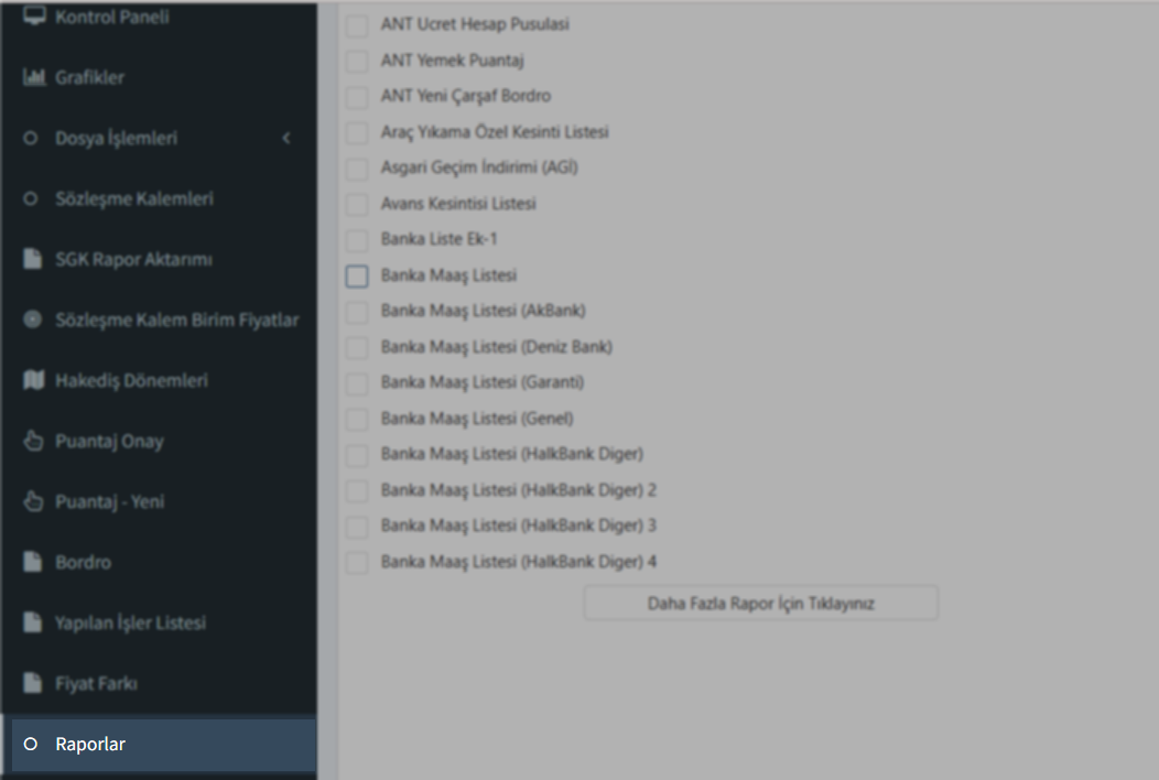Bu menü sayesinde personellerinize ait standart bordro çıktılarını alabileceğiniz gibi; süreç yönetimi için kritik olan Puantaj, İcmal, Hakediş ve Banka ödeme raporlarınızı da detaylı olarak dışa aktarabilirsiniz. Sistemin sunduğu diğer tüm özel rapor tiplerine ulaşmak için yine aynı menü içerisinde yer alan Bordro Raporları seçeneğine tıklamanız yeterlidir.
