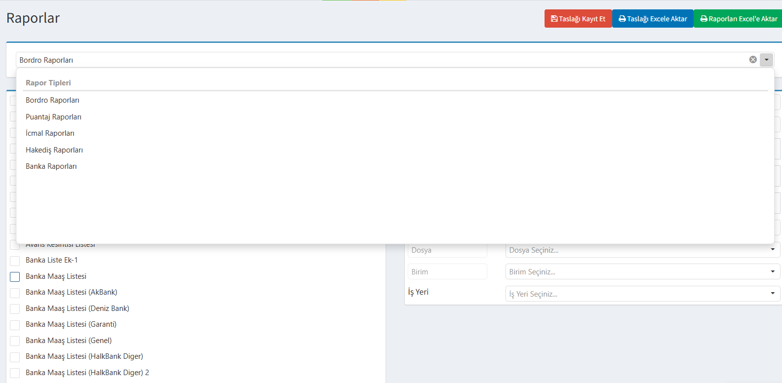 Bordro ve hakediş süreçlerinize ait tüm veri dökümlerini, sistemdeki sol menüde bulunan Raporlar ekranı üzerinden kolayca Excel formatında indirebilirsiniz.