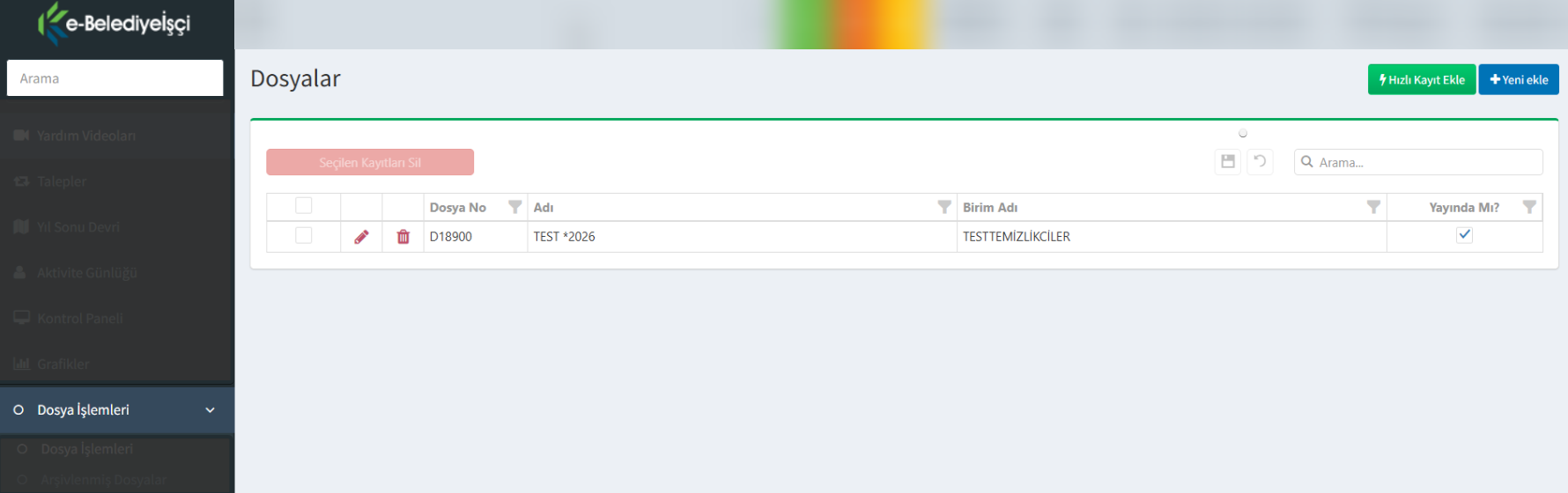 Dosya Listesi: İşin başlangıç ve bitiş tarihlerine göre filtrelenmiş kayıtlar yer alır.