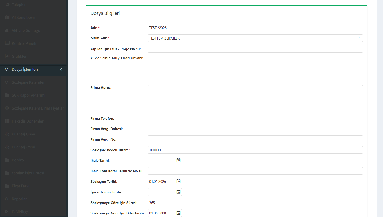 Firma Bilgileri: Yüklenici firmanın adı, adresi ve vergi bilgileri gibi resmi dataların girişi.