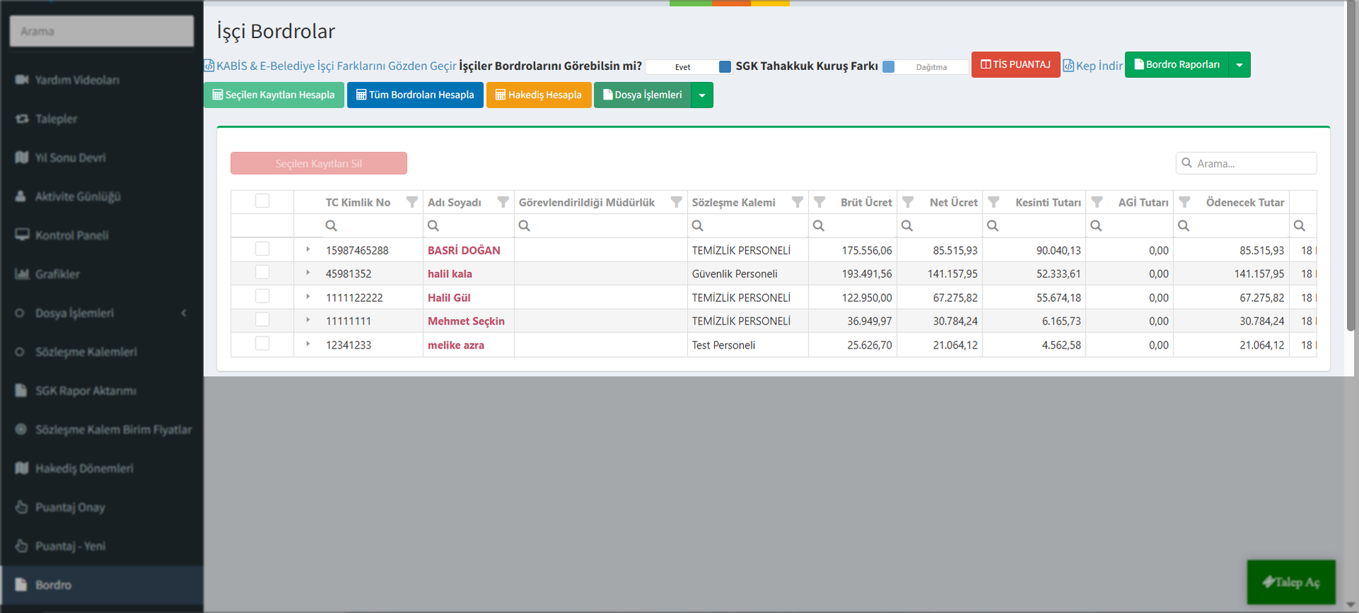 Puantaj girişlerini eksiksiz bir şekilde yaptıktan sonra, işçilerinizin maaş ödemelerinin, yasal kesintilerinin ve net hak edişlerinin hesaplandığı aşama Bordro menüsüdür.