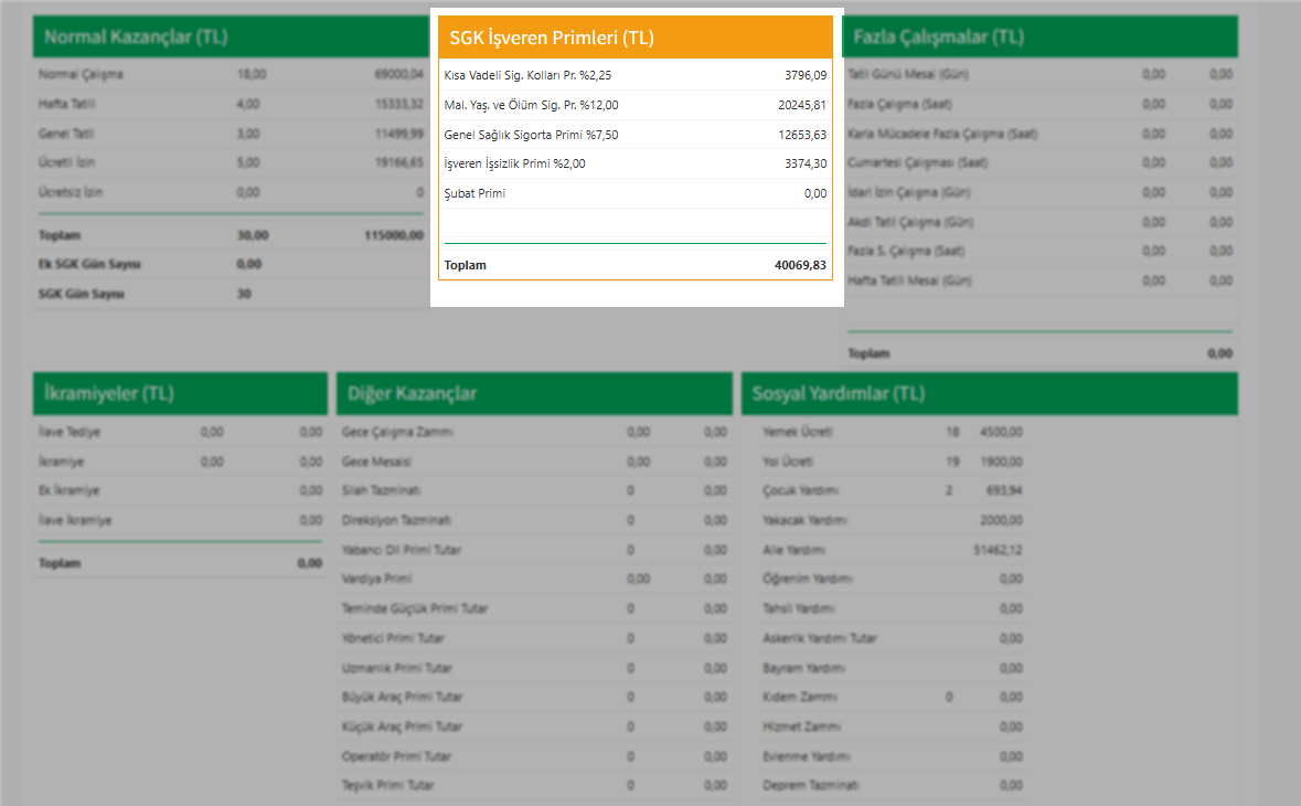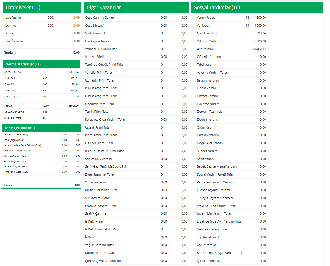- Yeşil Alanlar (Kazançlar): Maaş, sosyal yardım ve ikramiye gibi personelin o ayki tüm brüt kazanç kalemlerini ifade eder.